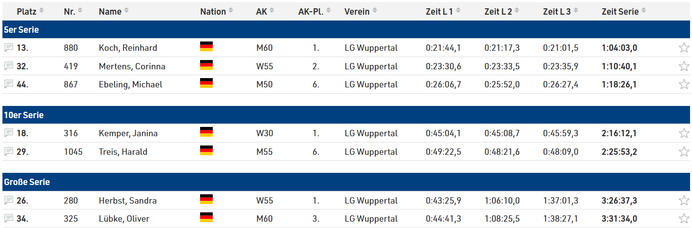 Einzel 2. Desiree Richter 44:43 26. Michael Hanstein 53:31 28. Martin Niederprüm 53:47 2er Teams 1. LG Wuppertal Kolja Lindner Benjamin Lehmbach 33:53 3. Hase + Igel Marc Walter Ruben Lange 34:47 7. LG Wuppertal Jens Krause Janina Kemper 40:26 10. LG Wuppertal Anke Lenhart Andreas Gehla 42:26 Einsteigerlauf 5km 3. Pascal Albrecht 24:29Ergebnisse | my.race result