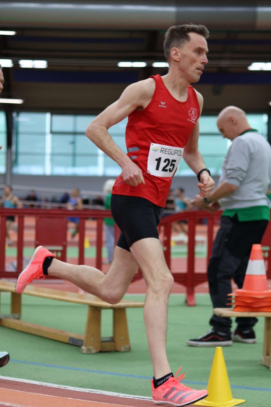 Es war ein Wochentag. Es war ein Mittwochabend zu dem unsere drei bzw vier Athleten anreisten. David Fleschen als Nummer vier, vom TV Herkenrath, der genau einen Tag nach diesem Rennen seinen Wechsel für 2026 zur LG Wuppertal bestätigte. Wir freuen uns sehr, dass er unser Team verstärken wird. Zurück zum Event: es gab bunte Lichter, es gab Musik. Die Stimmung war entsprechend gut. Die Atmosphäre hat uns allen sehr gefallen und wir kommen gerne wieder. Wettertechnisch hatten wir Glück. Für einen Oktobertag war es mit 14°C zur Startzeit um 18:45h noch relativ warm. Die Rennen, die angeboten wurden waren nur drei an der Zahl: 100m, 1000m und 10.000m.Unsere Athleten gingen alle zusammen in dem ersten von zwei 1000m-Rennen an den Start. Ganz vorne weg, praktisch ein Startzielsieg: David Fleschen. Ewout Hilferink zeigte sich auch mal kurz vorne musste aber im Endspurt David vorbeilassen und kam mit 2:52 Minuten auf Platz 2. David lief 2:50 Minuten. Auf Platz 4 kam Benjamin Lehmbach und musste auf den letzten 200m noch richtig spurten um die 3 Minuten hauchdünn zu unterbieten. Auf Platz 10 kam unser Reinhard Koch ins Ziel. Für ihn waren es 1000m in 3:33 Minuten.