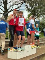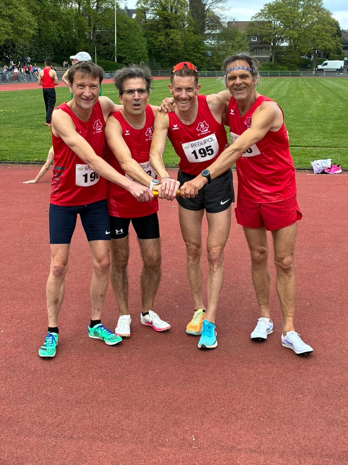 Unsere M50-Staffel gewann ebenfalls in ihrer Altersklasse mit einer Zeit von 4:28,61 Minuten. Herausragende Leistung kam hier von Startläufer Alexander Palm, der seine Zeit aus der Halle deutlich und zwar auf unter 63 Sekunden herunterschraubte. Gian Luca Madeddu, Reinhard Koch und Harald Damm vervollständigten das Team und feierten ihre Goldmedaille.